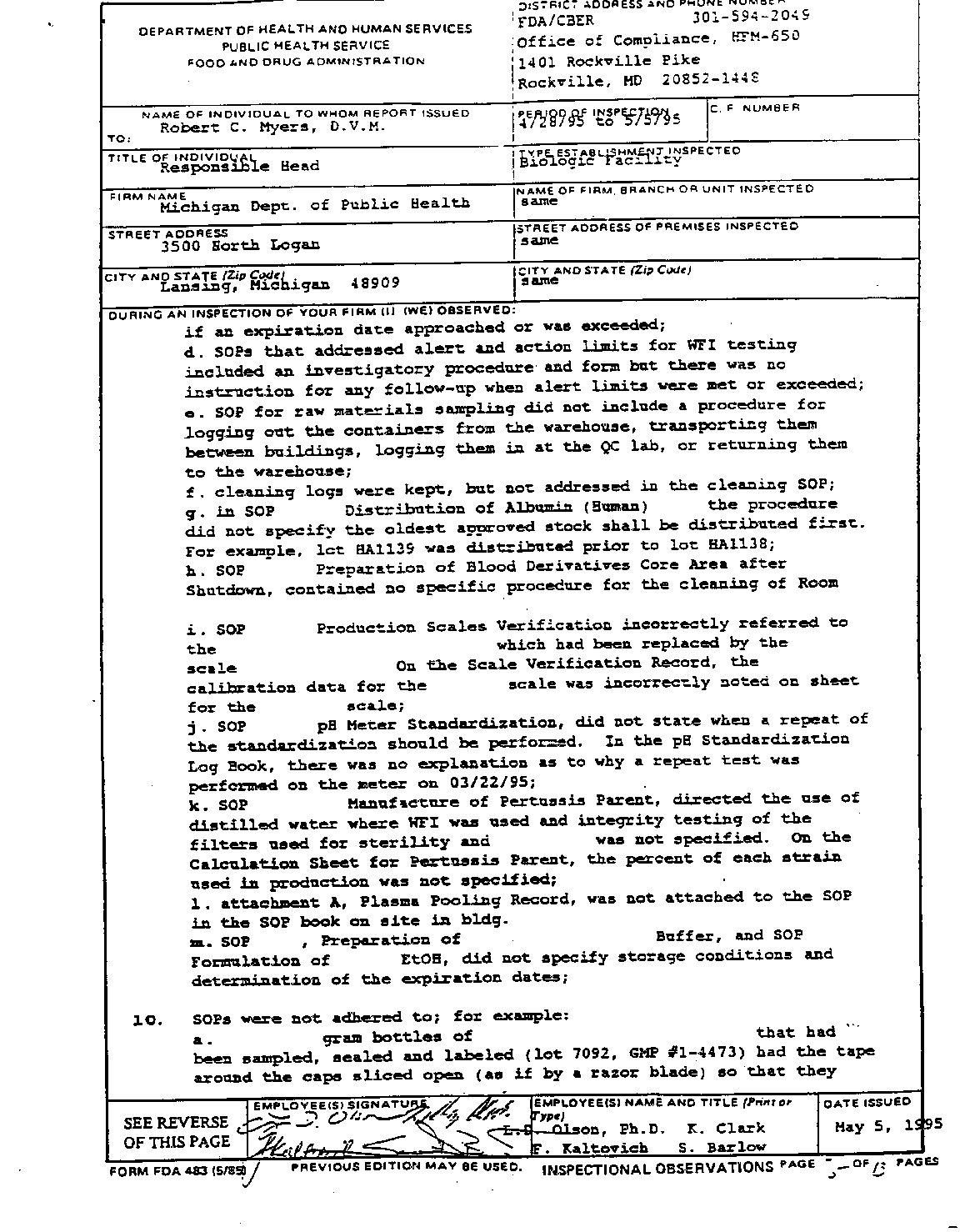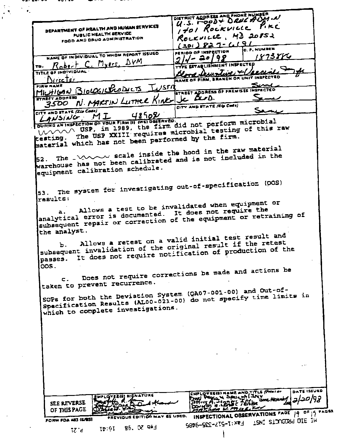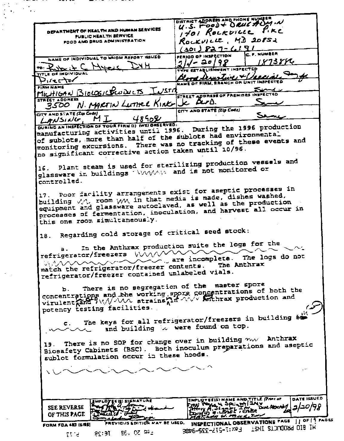 - inspection reports of the Michigan Biologics/Bioport facility. This