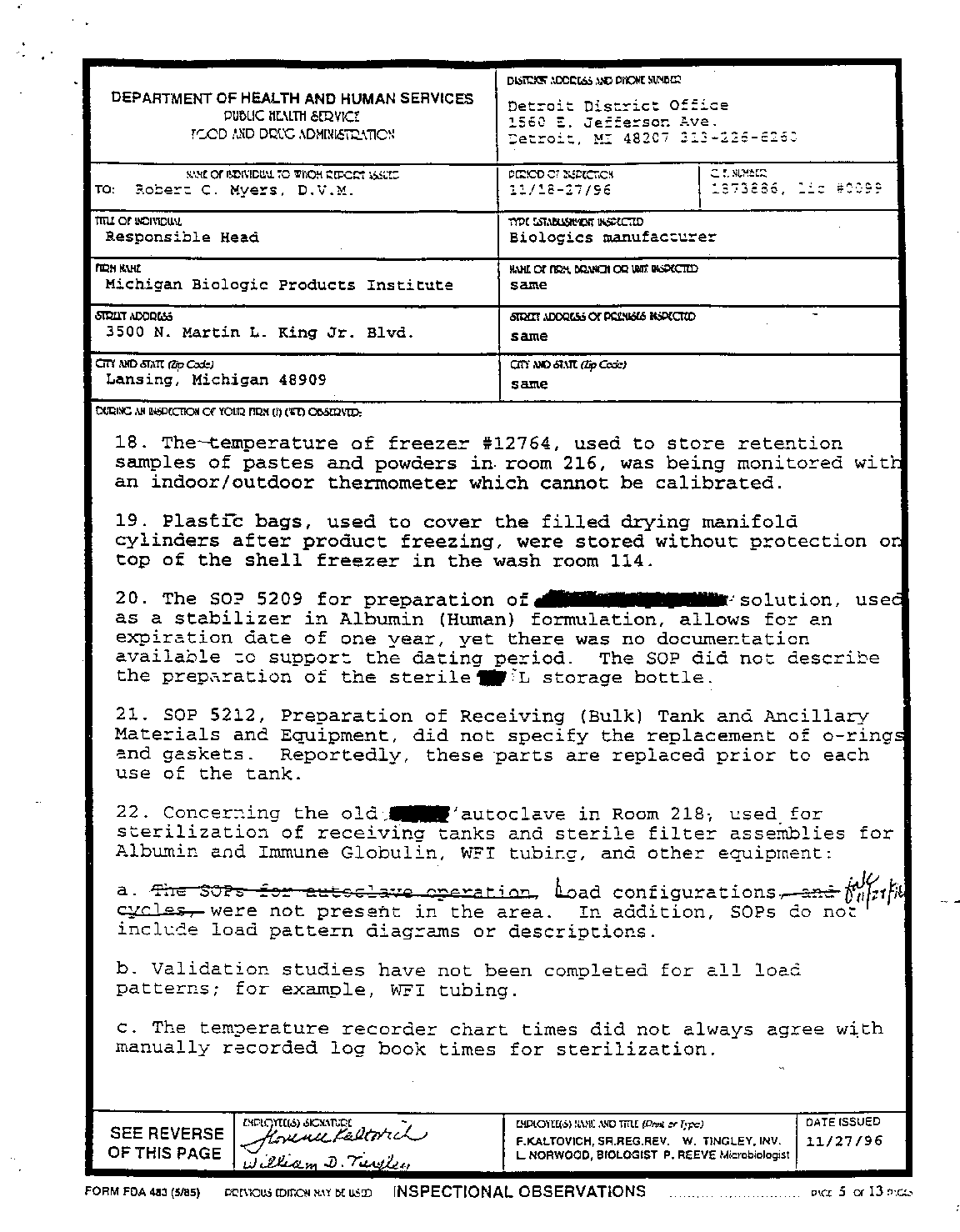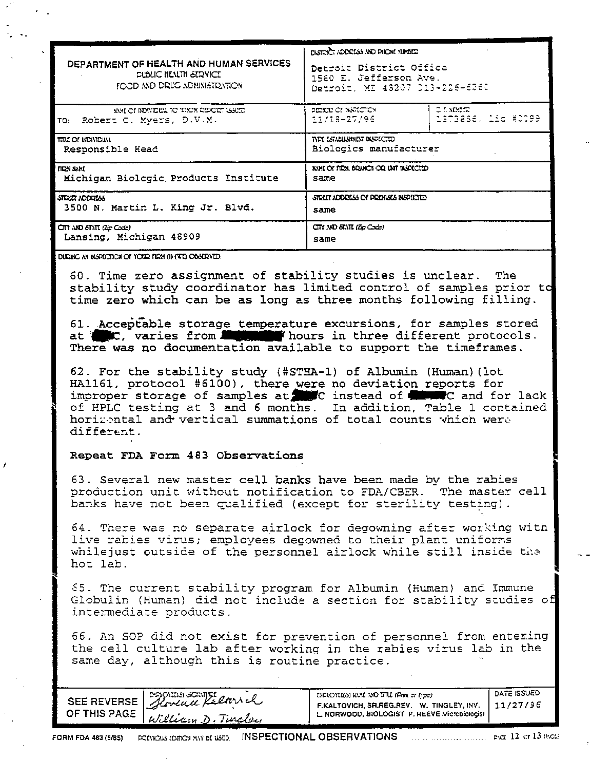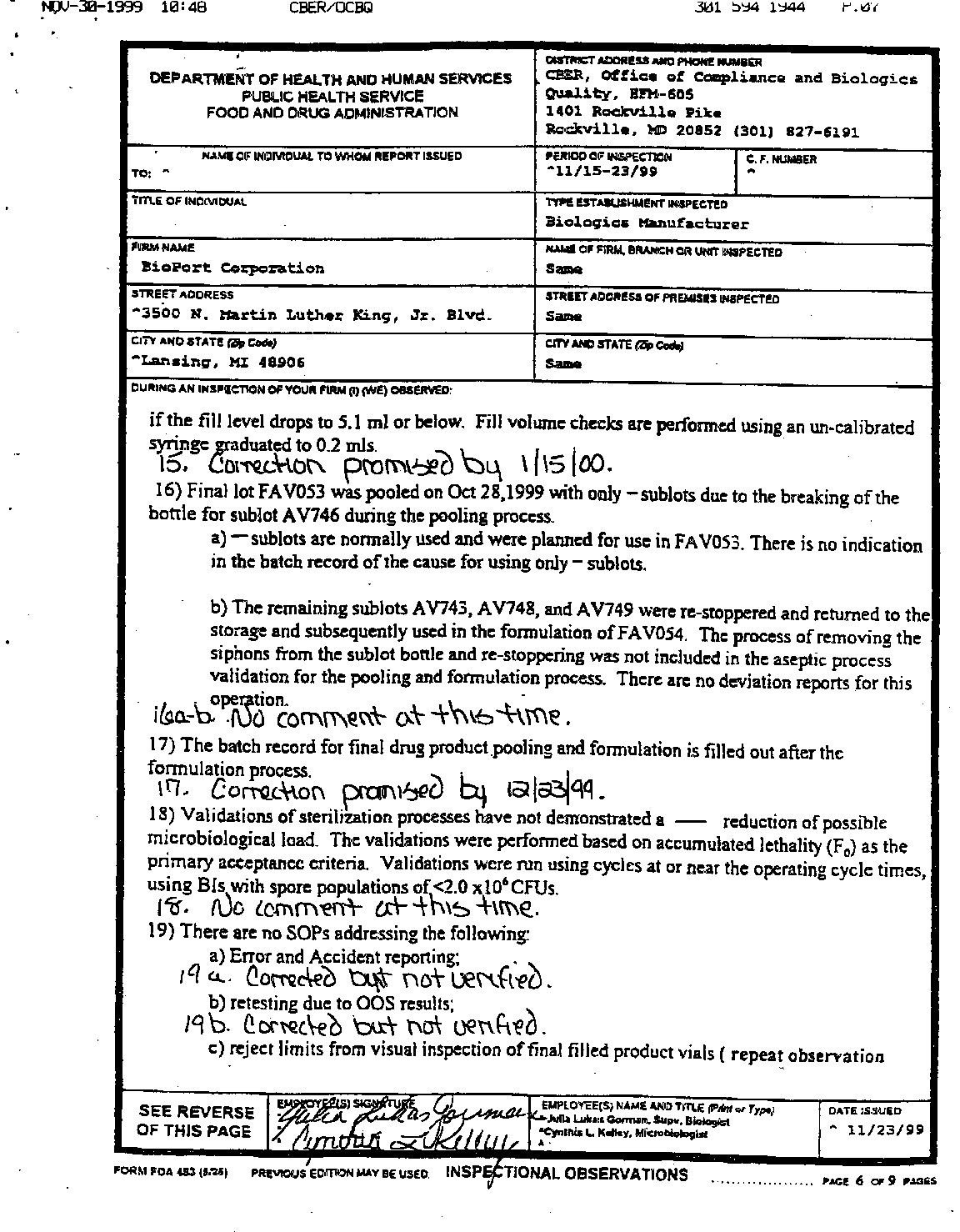 - inspection reports of the Michigan Biologics/Bioport facility. This
