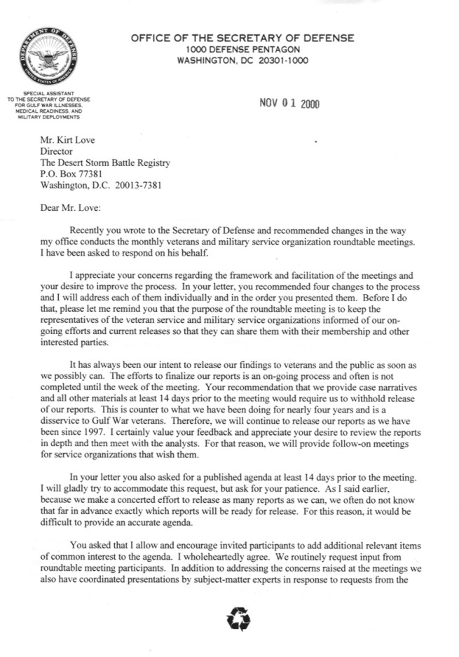letter we sent to SECDEF William Cohen concerning advanced notice materials on future NSO meetings at the Pentagon.